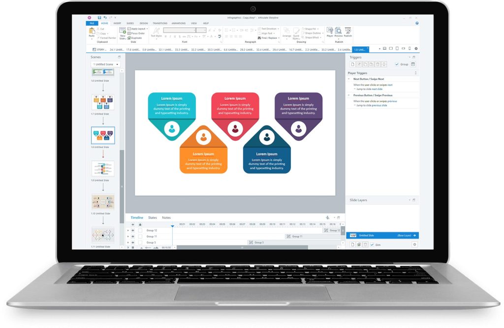 Ofrece una interfaz intuitiva similar a PowerPoint para la creación de cursos con muchas funcionalidades para crear interacción avanzada y combinarlo con contenido multimedia.